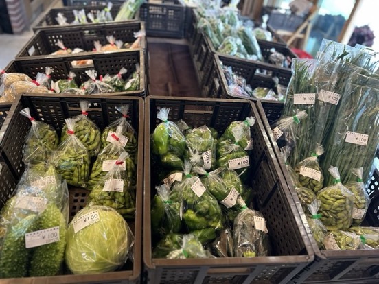 本日キャベツ、紫玉ねぎ、モロヘイヤ、ねぎ、ピーマン、にら、にんじん、かぼちゃ、とうもろこし、きゅうり、トマトなどの採れたて野菜が入ってきております。