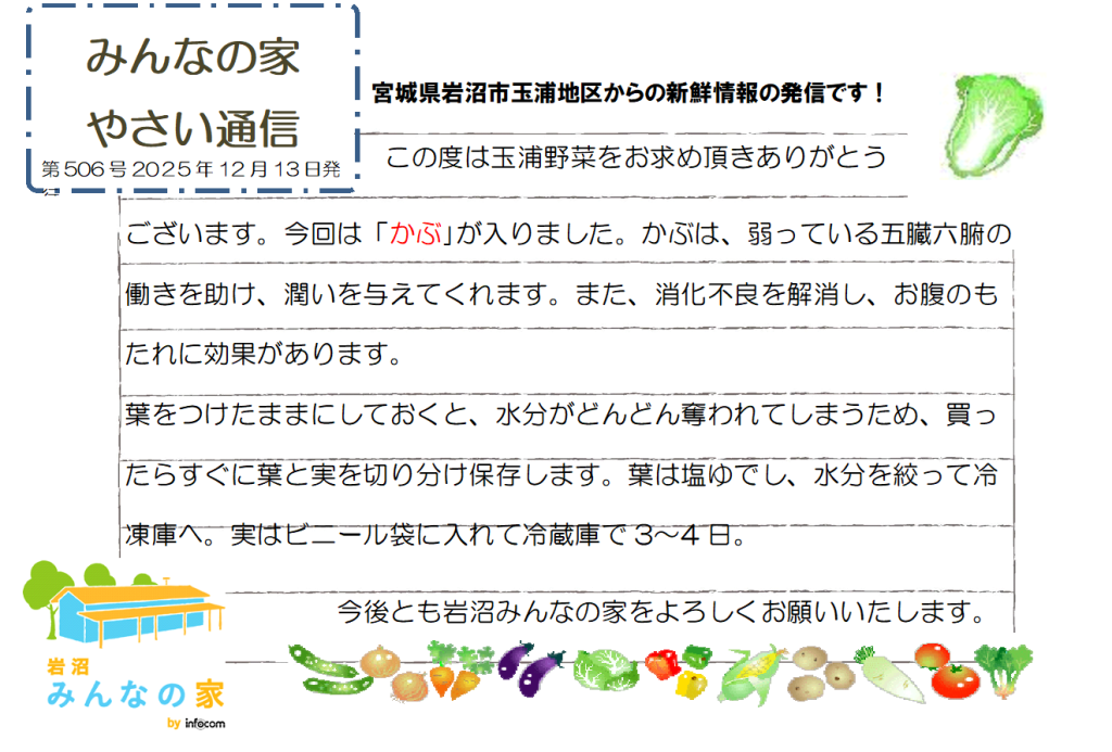 この度はみんなの家の直売野菜をお求めいただきましてありがとうございます。