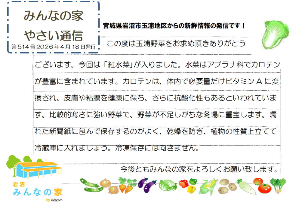 この度はみんなの家の直売野菜をお求めいただきましてありがとうございます。